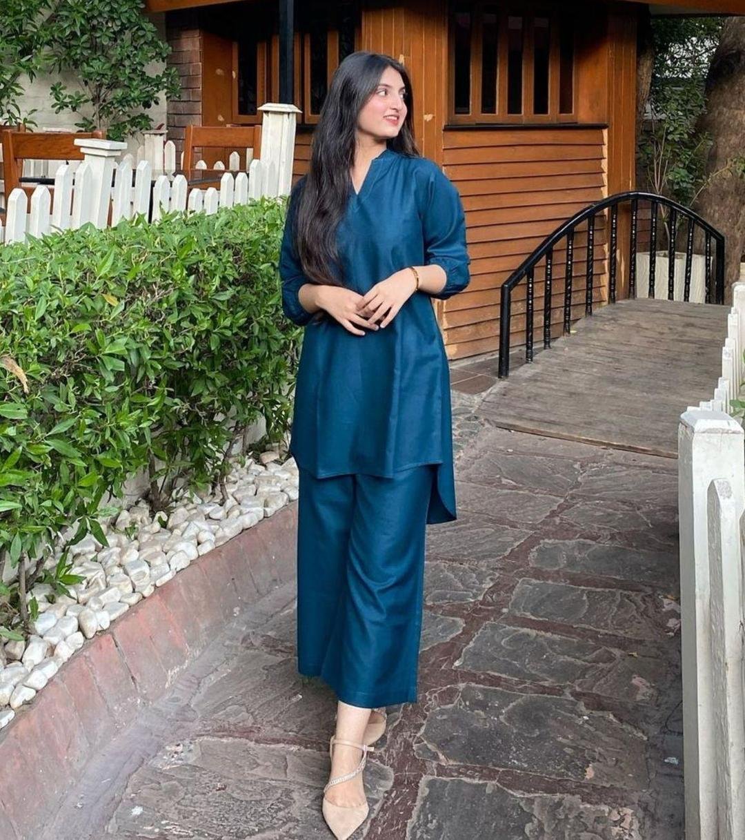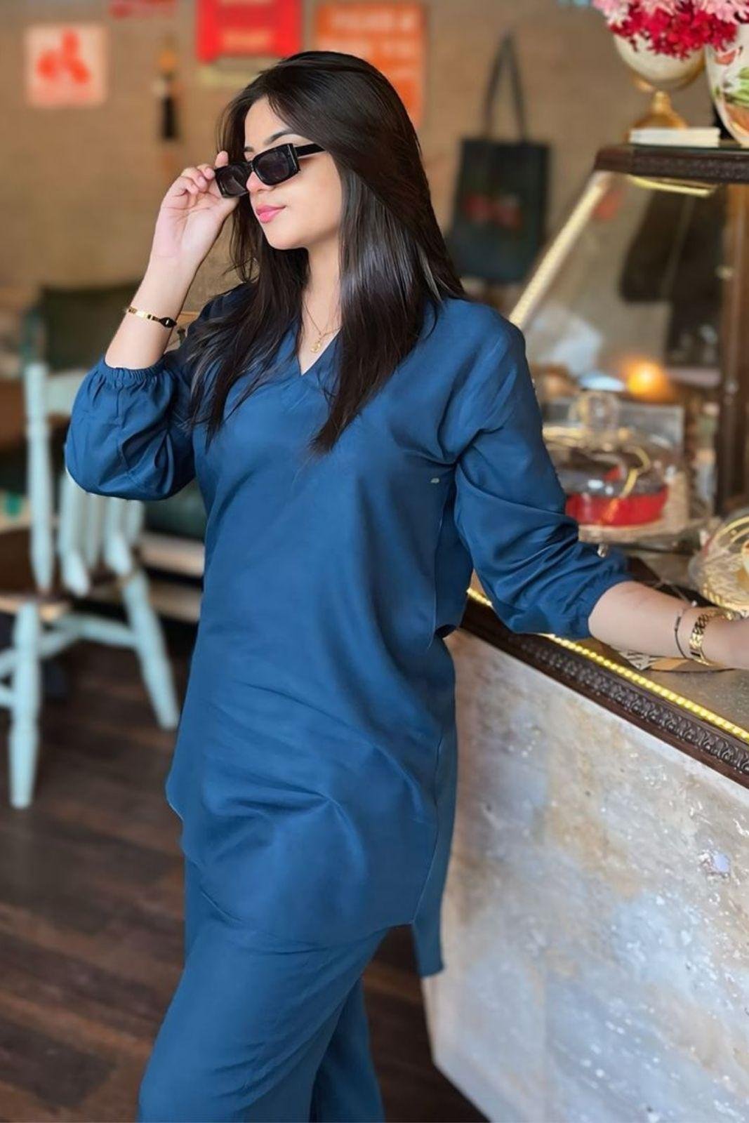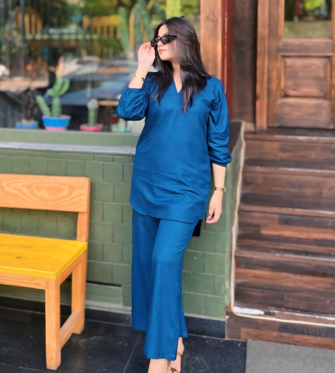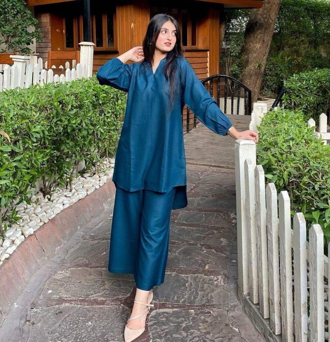 Stylish Women’s Stitched Co-Ord Set in Blue – 2 Pcs Cotton Plain Fabric
